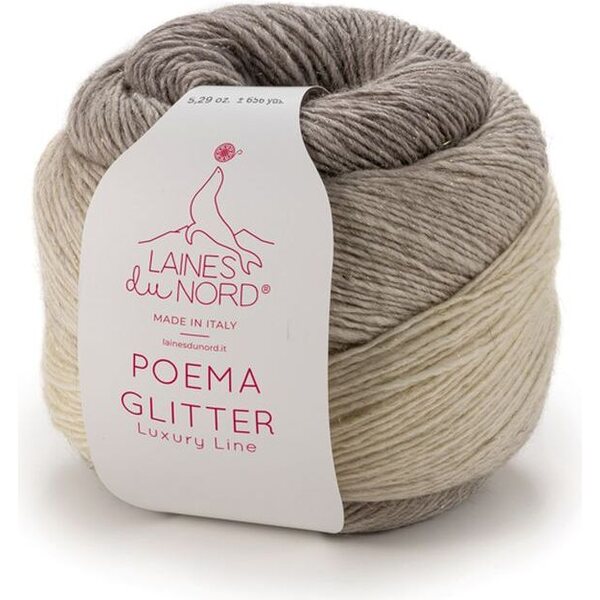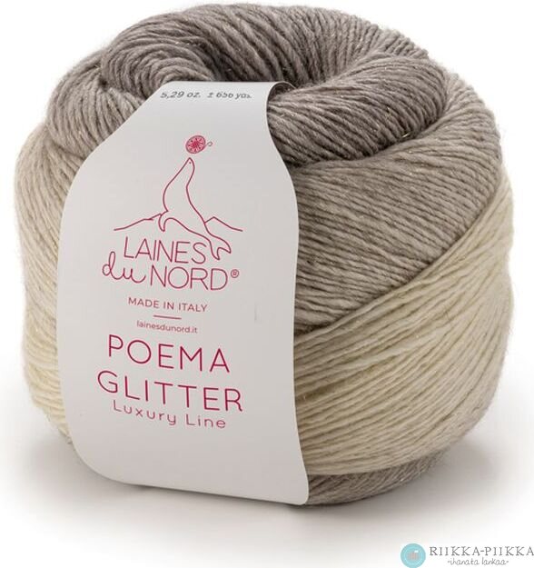 Poema glitter on upeasti pitkällä liu'ulla värjätty merinovillalanka, jossa on juuri sopiva määrä kimallusta - ei liikaa, mutta kuitenkin tarpeeksi. Tästä langasta syntyy upeat juhlaneuleet ja miksei vähän luksusta arkivermeisiinkin. Yhdestä kerästä piisaa ihan reilun kokoiseen huiviin ja pitkähihainen paitakin tulee kahdesta eli riittoisaa on.