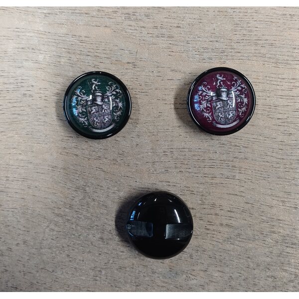 Kauniit kiiltävät napit, joissa vaakunamainen kuva.