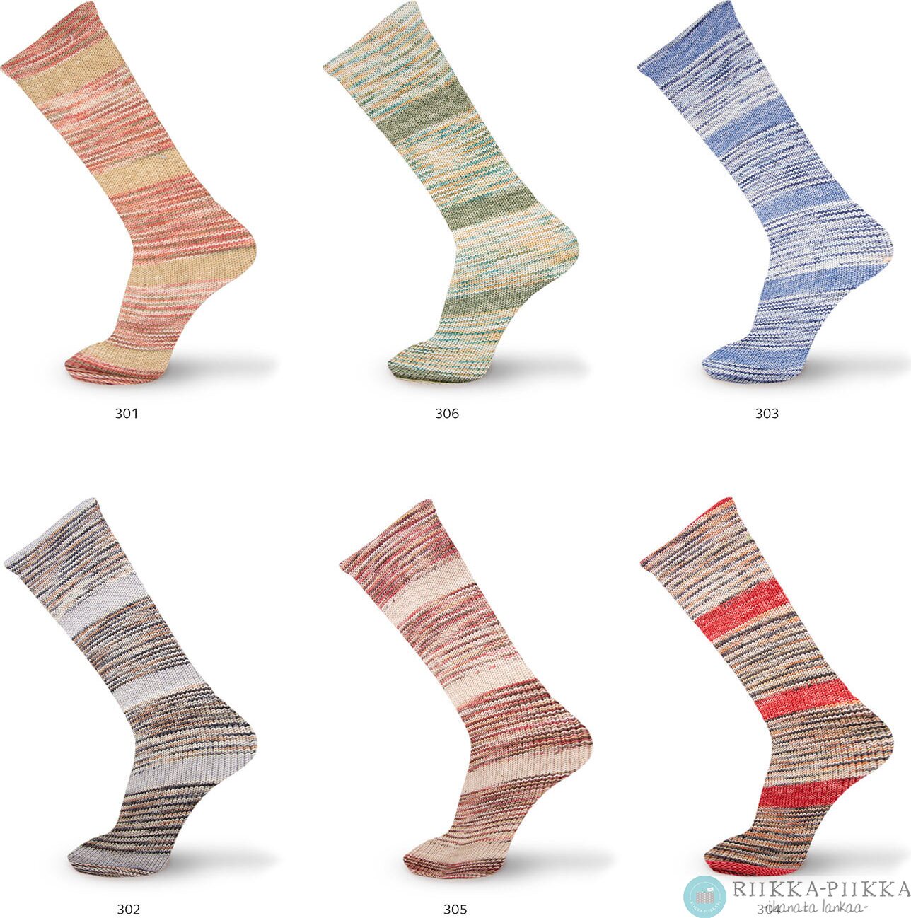 Ei tule pelkkää tasaraitaa, vaan on kauniin epäsymmetrisesti raidoittuva. Lanka sopii sukkalangaksi, mutta oikein hyvin myös muihin asusteisiin.