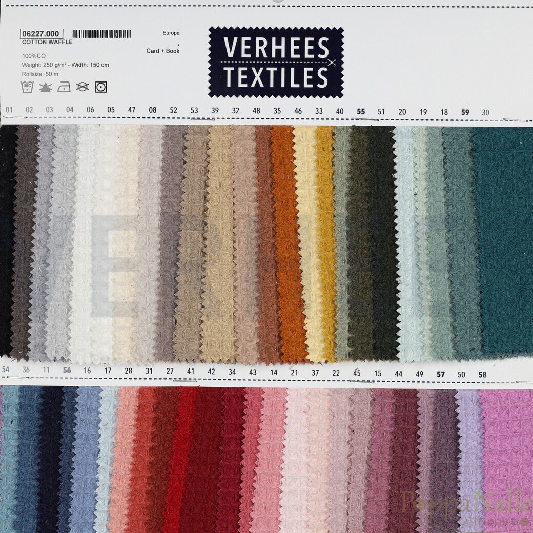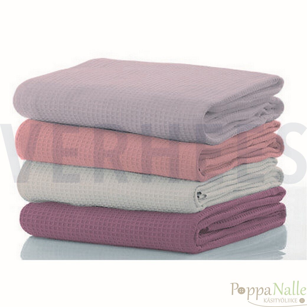 Puuvillainen vohvelikangas sopii hyvin erityisesti saunatekstiileihin. Tästä syntyy niin pyyhkeet, laudeliinat kuin kylpytakitkin. Tämä vohveli on hiukan isompi ruutuista kuin ihan se perinteinen vohveli.